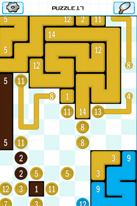 In this logic puzzle game you must connect coloured grid squares of the same colour and number with each other using only the number of grid squares denoted; i.e. two blue squares of 5 must be connected with a line covering 5 grid squares. Once completed the puzzle forms an image. Don't worry, it's quite easy to understand once you start playing, though bigger puzzles with longer lines can become quite challenging!